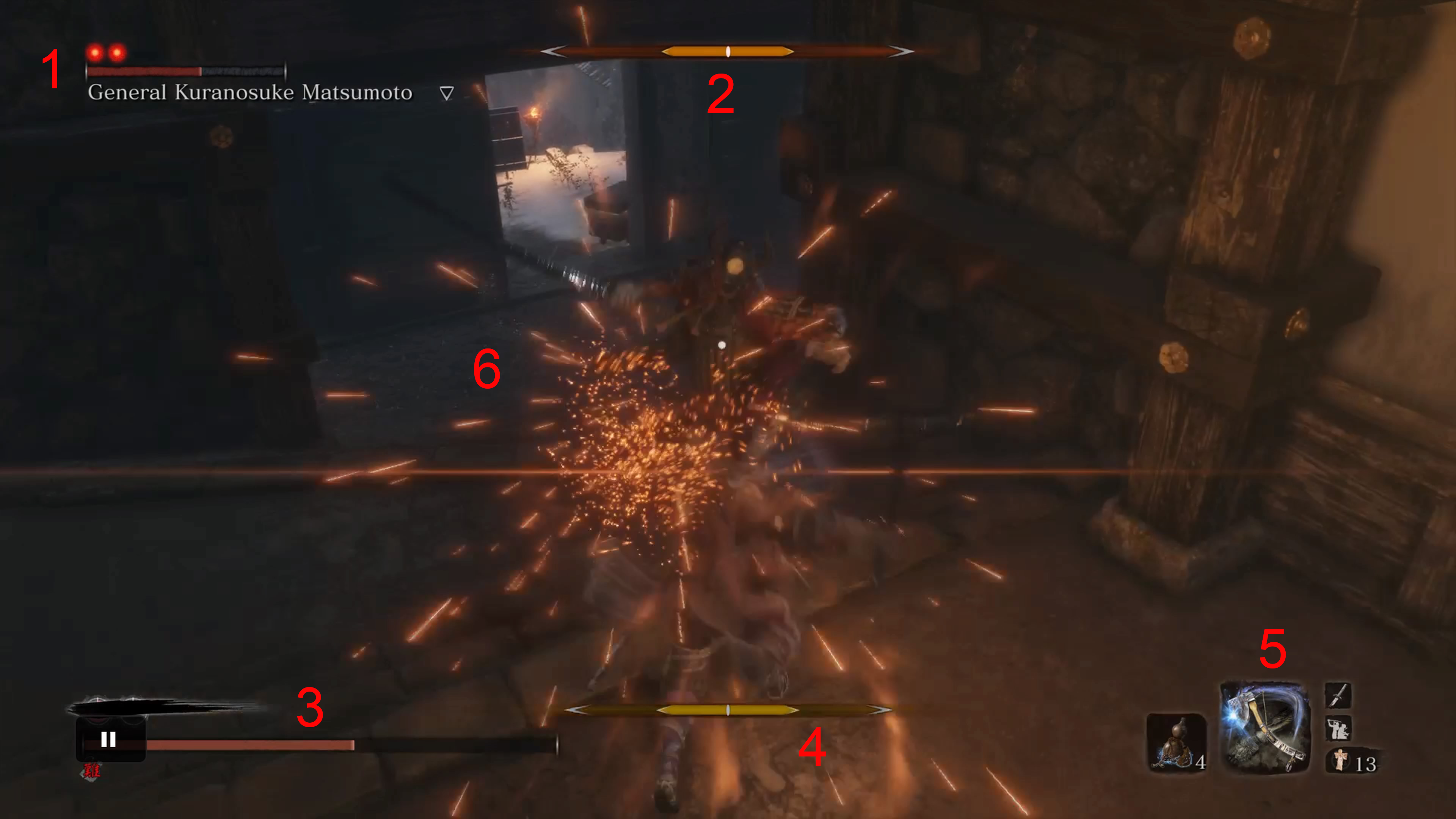 4: The Wolf’s posture bar. It works exactly like the enemy’s posture bar, however Wolf is not vulnerable to deathblows. Instead, he’s left open until he can recover. An easy way to do that is to dodge away.