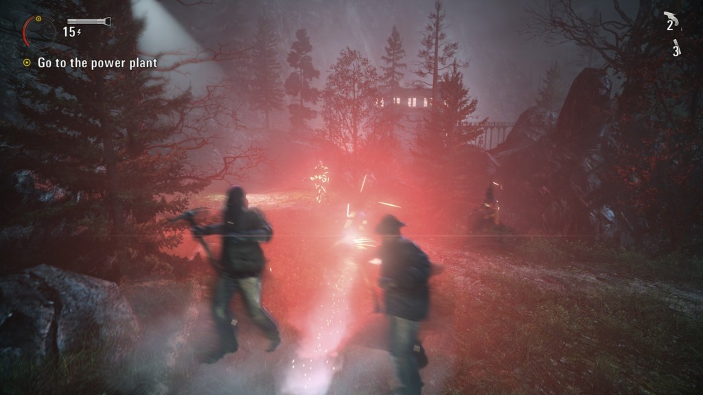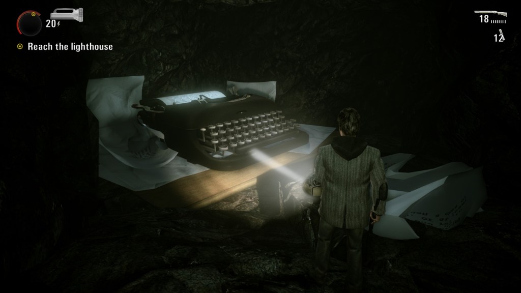 Perhaps ironically, the story of Alan Wake puts you into Alan’s shoes, beginning with a dream sequence that both acts as a tutorial and sets the tone of the game. Alan, a prolific writer, finds himself in a nightmarish landscape, pursued by some sort of dark force for a time, before a shapeless light begins to speak to him and explain how to protect himself and fight back against this force. The light guides Alan, stating “I will give you your dream back now” after teaching him what he needs to know and leaving him with perhaps one of my favorite weapons in a video game: the flare gun.