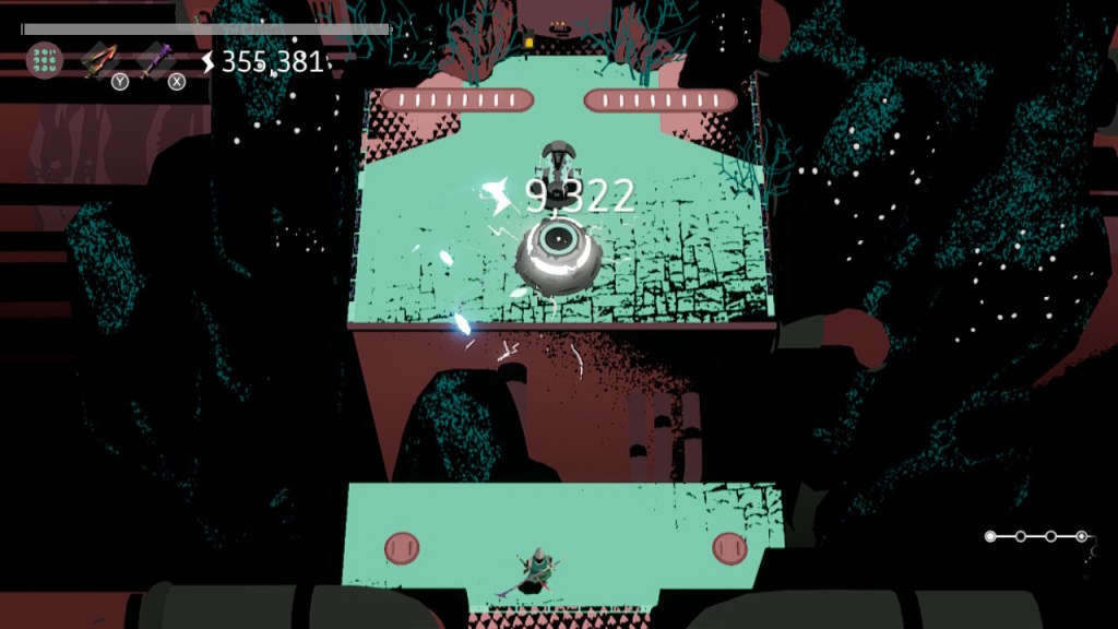 As the last remaining BOT-C, you navigate the various wings of the facility housing the machine while being intermittently harassed by the titular Creature. In order to progress deeper into the facility, you’ll have to strike panels using what are essentially pinballs to generate power that can be used to open and unlock nearby doors or (at a later point) to upgrade yourself to generate more charge for each ball. Your BOT-C is equipped with both a strike and charge tool to better facilitate this. The strike tool is designed, as the name implies, to strike the ball in whatever direction you’re facing. The charge tool is used to collect up to three balls at one time and energize them. Depending on the level of your BOT-C’s core, you’ll be able to charge the ball(s) with more power before striking it.