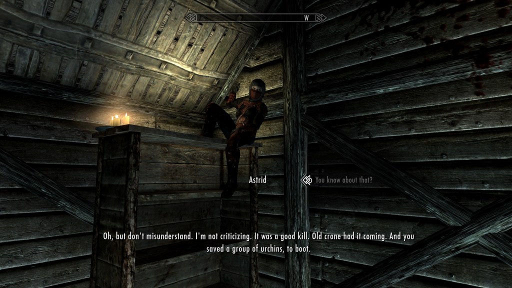 I’ll admit, when I first started on the endeavor that is this blog, I was simultaneously looking forward to Skyrim and dreading it. Why? Well, on one hand it’s got a lot to do and it’s an easy way to pass the time, but on the other hand it gets samey very quickly. And I know that when I get settled into a routine in a game it starts to kill the fun for me. Don’t confuse that for me hating gameplay loops. Those are routines as well, but those are necessary loops that happen on a moment-to-moment, minute-to-minute basis, or even longer. That’s how you get your players engaged. Rather, I don’t like having a set schedule for myself in an open world game. And that’s something Skyrim kind of gets you into. I’ll explain that a bit later.