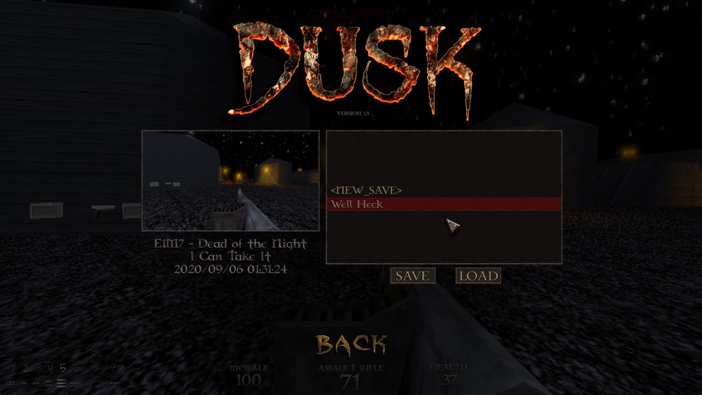 Sadly that’s about the extent of my Quake knowledge. But! DUSK follows an episodic format, so its mission structure is akin to classic DOOM (E1M1, E1M2, and so on) and you retain your weapons, ammo, health, and morale between missions. Provided you continue straight on that is. I never tried the level select option, but I would assume that, just like in DOOM, you start with full health, no armor, and your melee weapons to your name. And you can save at any time, so if you’d prefer to pick up where you left off rather than restarting from zero any time you load up the game, you can do that! And you can name your save files, too!