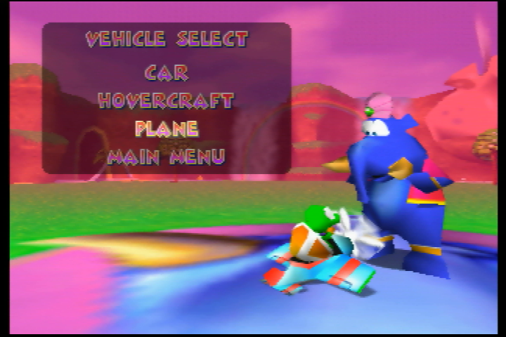 Krunch might not have been the best character to start with. He’s heavy, so he doesn’t turn or speed up all that well. But it’s harder to push him around as a result. Fortunately, Dino Domain is very forgiving in that regard. The stages are pretty short and don’t have a lot of sharp turns or pitfalls to worry about. It’s very much there to help you get accustomed to the controls without much to worry about. And man it handles a little bit looser than you would expect from other games like Mario Kart 64 (an article down the line for sure), but you also have more vehicle options: a kart, a hovercraft, and a plane.