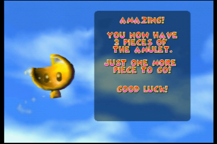 Once you collect all four piece of Wizpig’s amulet, the stone head near Dino Domain opens up and you can take him on at last. It’s not an easy race though. Wizpig is fast enough that you need to hit every single zipper on the track if you want to get ahead of him in the three laps you have to race. One miss and you’re done. But once you’ve won, that’s it! Game’s finished!