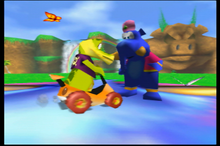 So that’s three of four worlds down, but where’s the fourth? Well, as it turns out, it’s tucked behind a waterfall near the hub. Both of our reptile friends have had a go and I really don’t like Pipsy the Mouse for some reason (search me, I don’t really know why), so I had to choose between a handful of the remaining racers.