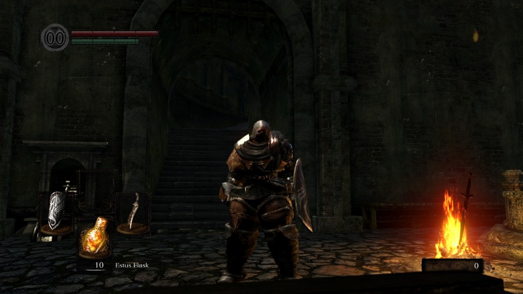 That’s another thing I should cover real quick: Dark Souls and its family members (including Demon’s Souls and Bloodborne) are a sort of hybrid game. While primarily singleplayer, you can summon other players to help you or they can invade your world and try to kill you if you meet the requirements. Those requirements? You just need to be human. See, Dark Souls has two different states for the player: hollow (you look like beef jerky and have no eyes) and human (you don’t look like beef jerky and have eyes). Aside from not being able to summon or be invaded when hollowed, the only drawback is that you can’t kindle bonfires to permanently increase the number of charges on your healing flask. That’s something that needs to be done while human.