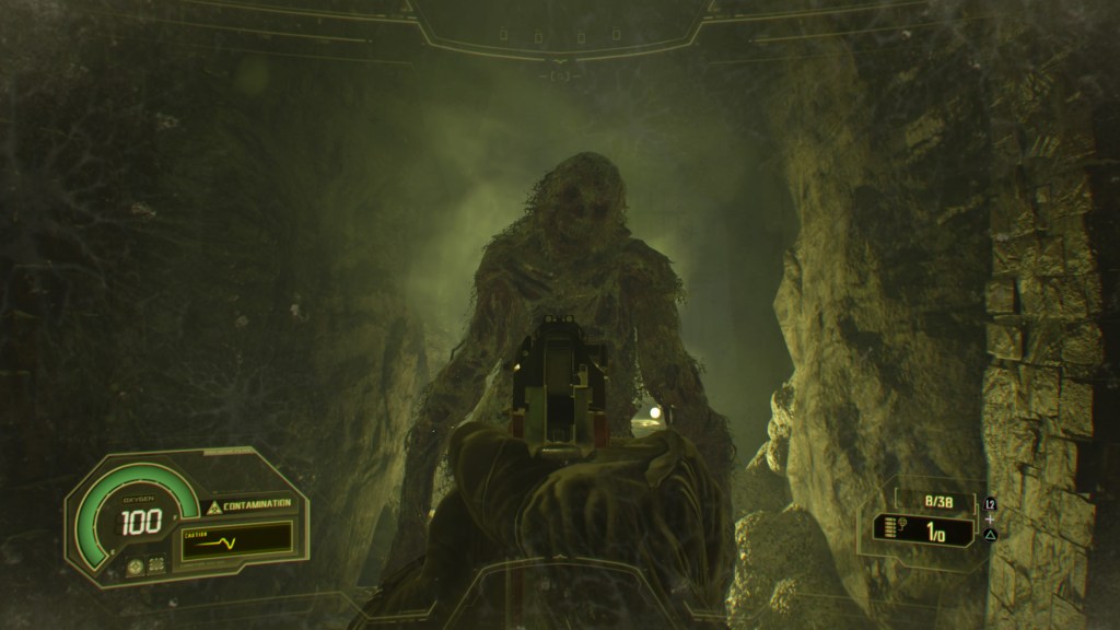 Not A Hero also bridges the gap between classic Resident Evil and modern Resident Evil by providing Chris with a somewhat vague indicator of his health that shows displays a heartbeat in three different states and colors. Green is fine, yellow is caution, and red is danger. It’s a nice little bit of nostalgia for the first couple of games (again I haven’t played 3 in a while so I don’t remember) that actually works with Chris’ heads-up display in his helmet. It’s not quite diegetic, but it does help with immersion, so I like that.