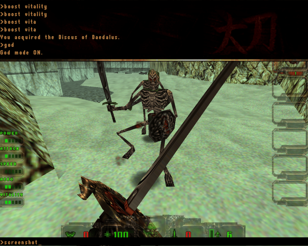 And that brings me to my explanation for the cheats visible in the above screenshot. When you reach Wyndrax Tower in Episode 3 (E3M4), saving on the second map of two causes the game to become unstable and more often than not crash when the titular Wyndrax tries to attack you. This is more commonly known as the Wyndrax Crash Bug and was what ultimately led to my downloading patch 1.3. Unfortunately, this also wiped out my save files, so basically I had to start from scratch. But since I really just wanted to get back to where I left off, I decided to jump back to E3M4. Then I learned that doing so reset all of your stats to their starting points, including the Daikatana’s strength. So I jumped back to E2M1 in order to start powering it up. I boosted my stats to where I had them prior to the crash so that I could just focus on powering up the Daikatana, but eventually I got impatient with that and just went back to E3M4, accepting that I probably wouldn’t see the full form of the Daikatana. It’s a shame, but at least the game didn’t crash this time!
