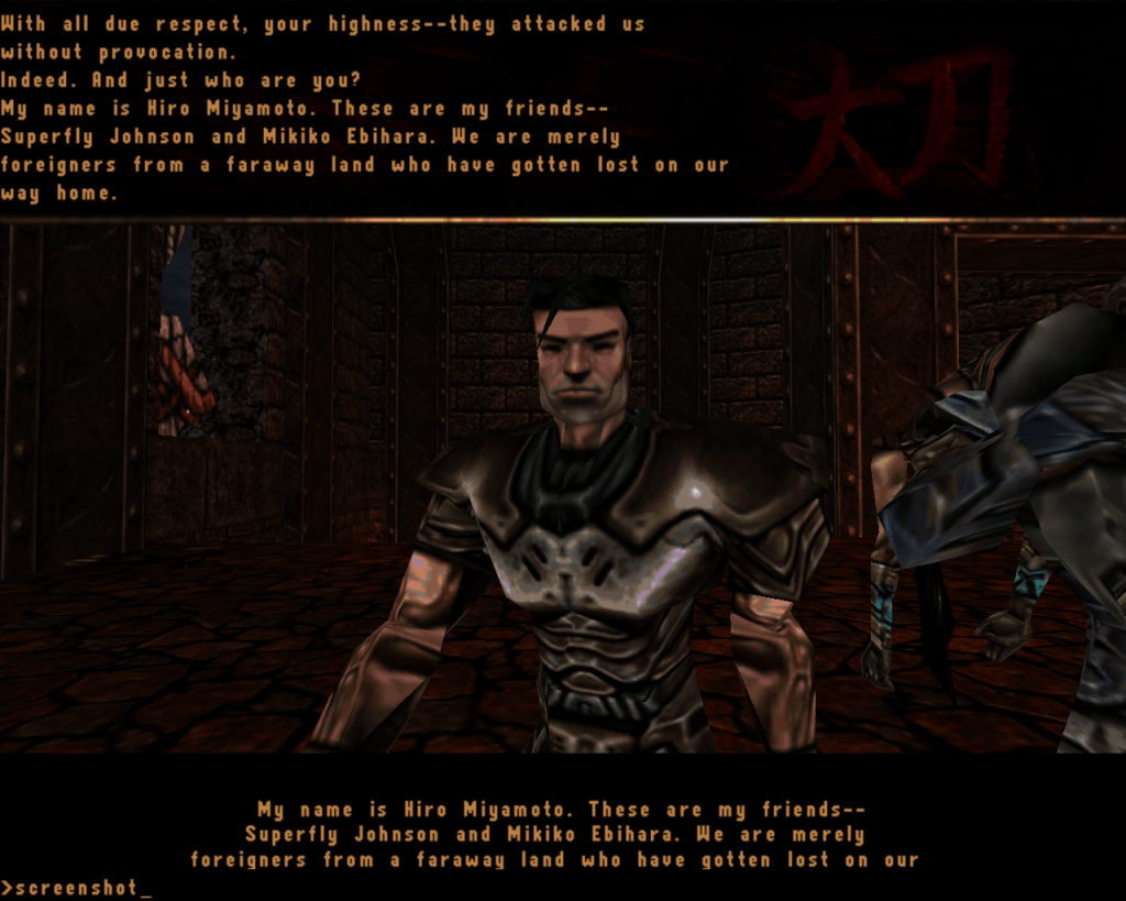So one of the big selling points for Daikatana was the inclusion of AI sidekicks. These take the form of two characters: The aforementioned Mikiko Ebihara, and my personal favorite character of the trio, one Superfly Johnson. That is actually his name. He’s voiced by Marcus Mauldin (who some of you may know better as Brick in Borderlands) and he made a lot of my deaths so much more bearable with the hysterical sobbing that followed. I know it was supposed to be sad, or at least frustrating, but I couldn’t help but smile when Superfly regained his composure and immediately started calling dibs on Hiro’s possessions. And this carried into the loading screen! Other highlights include what I can only call his Arnold Schwarzenegger impression when you stand around for too long. For all I know it could be him clearing his throat a lot to try and get your attention, but some of these wander suspiciously close to “eaugh” territory for me to write it off that way.