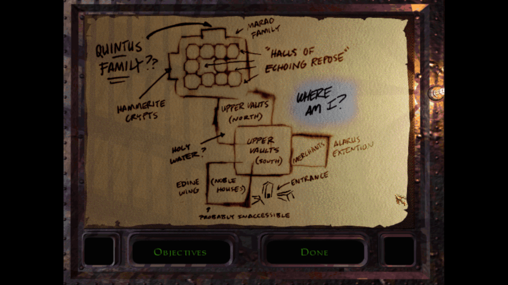 Some might complain that it’s hard to read, but I would argue that’s the point: a map isn’t supposed to act like a GPS and give you your location moment-to-moment. Rather, a map is intended to help you get your bearings, which is what it does here. Garrett has a compass to properly orient himself throughout the level, and the shapes of the buildings on the map are accurate to their layout in The City. I passed by that arrow cache at the bottom a few times before I figured out its exact spot and when I finally did, it was like something clicked. I just sat there thinking “Ahhh I get it now.” Honestly, once you have a rough idea of where you are and where you need to go, using the compass will typically get you the rest of the way. At least, that’s most of the time. I present to you the second map I want to show you, with the explanation that my brother warned me about this one in advance: