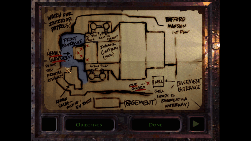 If I were to give any advice for a first-timer playing Thief, I would have a few things of note: take your time, read everything you can, and maybe remap your controls. I found myself a bit disoriented at first when the A and D keys didn’t strafe but instead turned me left or right respectively. It’s up to you though! For what it’s worth I had a lot of fun playing Thief and I’m glad to have taken the time to sit down and do so at last. The character interactions are fun, Garrett is justifiably cocky given his talents, and it’s really neat just how many ways there are to reach your goals. With that in mind, I give Thief Gold a recommendation.
