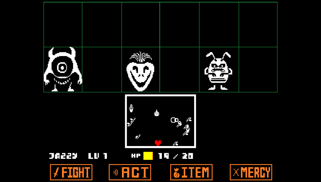 The core gameplay of Undertale revolves around your character, the fallen child whose name you choose (I went with Jazzy, but you have six characters to play around with. You’ve found your way into the Underground, a place filled with a number of monsters such as the above ghost and Froggit and separated from the human world by a magical barrier. Combat happens via random encounters like you would expect in earlier Final Fantasy titles, but fighting itself is done in a number of ways. You can fight, perform an action (ACT), use an item, or spare the monsters you encounter provided you’ve met the right criteria (MERCY). This sets Undertale apart from a lot of other RPGs: no one has to die. You can get through the entire game without killing a single monster. It might be tricky, but once you get the hang of it you can absolutely do it.