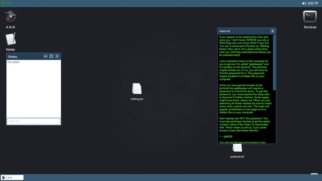 The A.N.N. browser makes a return, but you don’t have to worry about getting hacked this time. However, the browser itself is also different, probably due in part to the fact that you’re using a different computer. The loading bar isn’t your signal that a hash is tucked away somewhere on the site. Rather, the little globe icon at the bottom left of the browser will flash once the page is loaded if there’s a hash somewhere on that page. Not per site, but per page, so you’ll need to be thorough. It’s a little more devious this time around though, some of the hashes will appear in the game files on your actual computer and you need to open them in a text editor. I want to say that you can use notepad, but I used Atom because I had it on hand from recent adventures in trying to learn how to dive into SNES game code to better understand how Home Alone works. It was a whim, I swear. Anyway, some of the hashes will show up in the game files along with the terminal key that you need to unlock the darn thing in the first place and even beat the game. It’s clever and Adam even says it’s in a hidden file on your computer, but if I hadn’t been following a guide, I would never have thought to look in my own files. Escape rooms and ARGs are weird man.