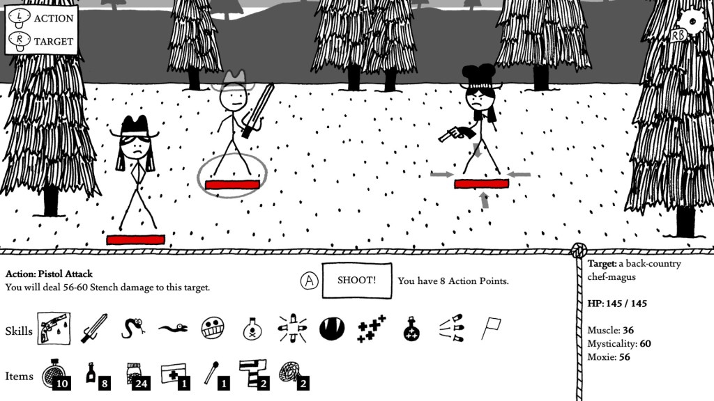 Now since this is an RPG, it’s important to note that you have three different classes you can choose from when making your character. These are: Cow Puncher, Beanslinger, and Snake Oiler. Each has a preferred method of attack (melee, magic, and guns respectively), and each has their own nonviolent method of resolving conflicts as well as how they craft items (intimidation/leatherworkery, outfoxin’/master cookery, and hornswogglin’/potionology respectively), so it makes each class feel different enough that playing one makes me wonder how the others play by comparison. But all things in time. As such, let me talk to you about the adventures of Stubbs Witherton, professional Snake Oiler.